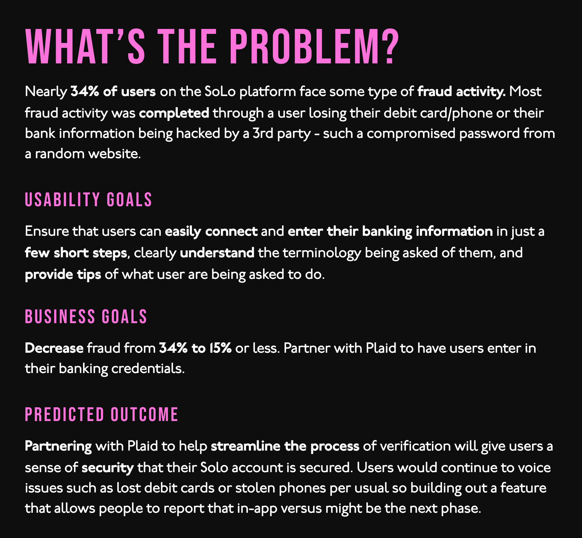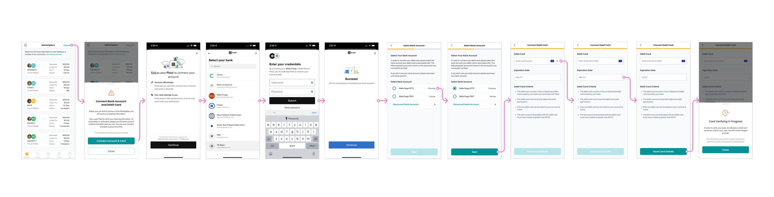 SoLo Funds is a peer-to-peer microlending native app where a user can request loans that are funded by the public. SoLo Funds Debit Card Verification was a new feature for SoLo to help prevent fraud activity amongst the user base. SoLo partnered with 3rd party platform, Plaid to let users connect their banking credentials. This is some deep thinking, technical shit, folks.