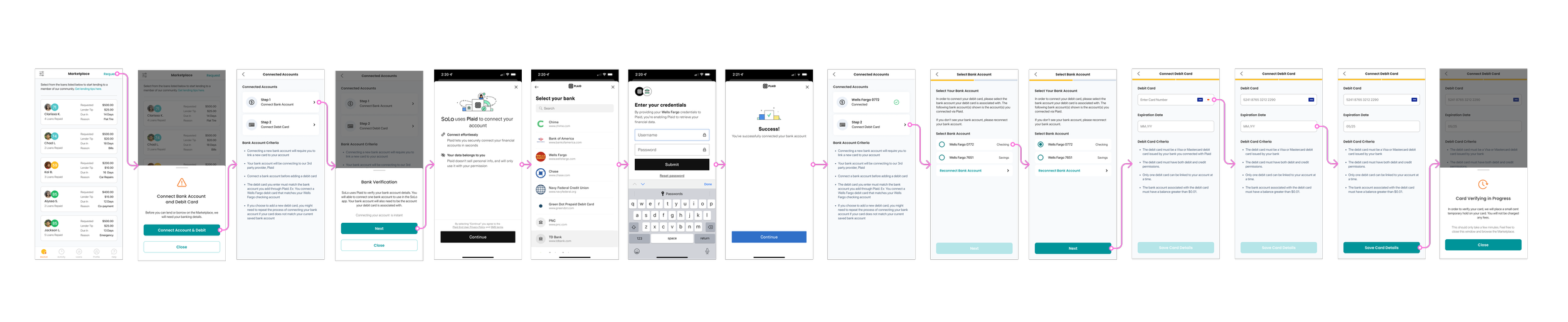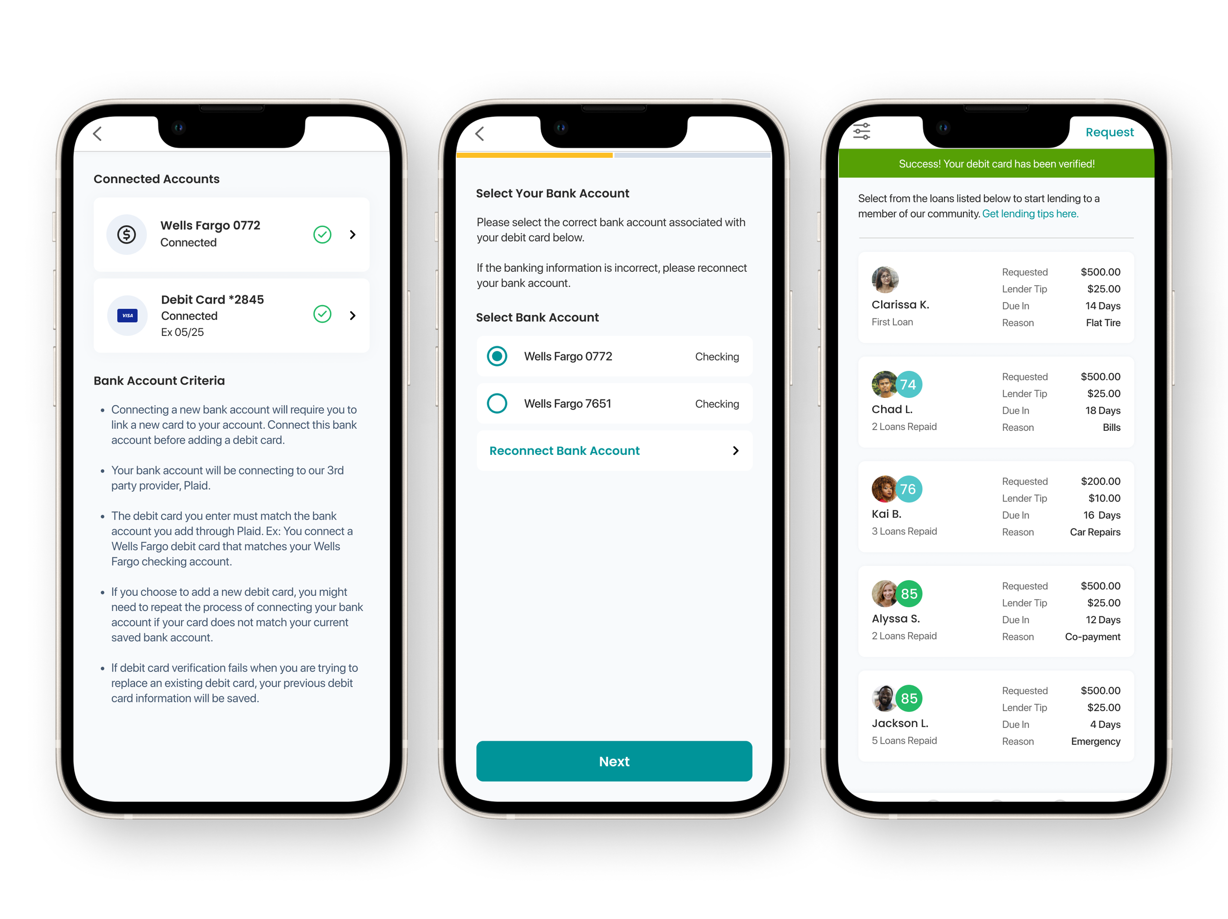 This feature was technically complex due to integration with a third-party platform and extensive backend API calls. I designed separate flows for three user types: Power Lenders (trusted users who bypassed Plaid), new users, and current Borrowers. Most fraud concerns involved new users. Multiple entry points for users to enter their information were created across Settings, Wallet, and Marketplace.