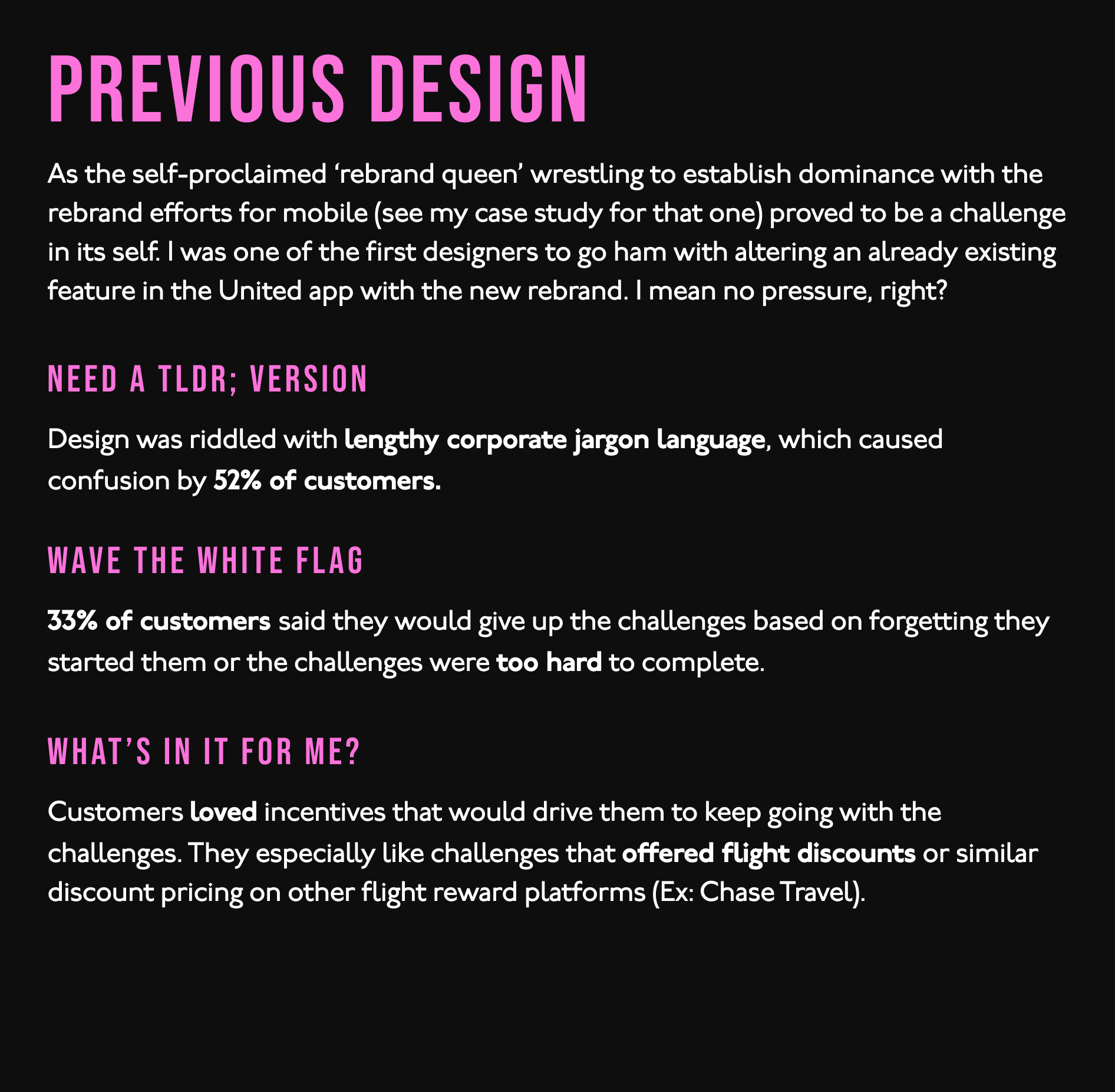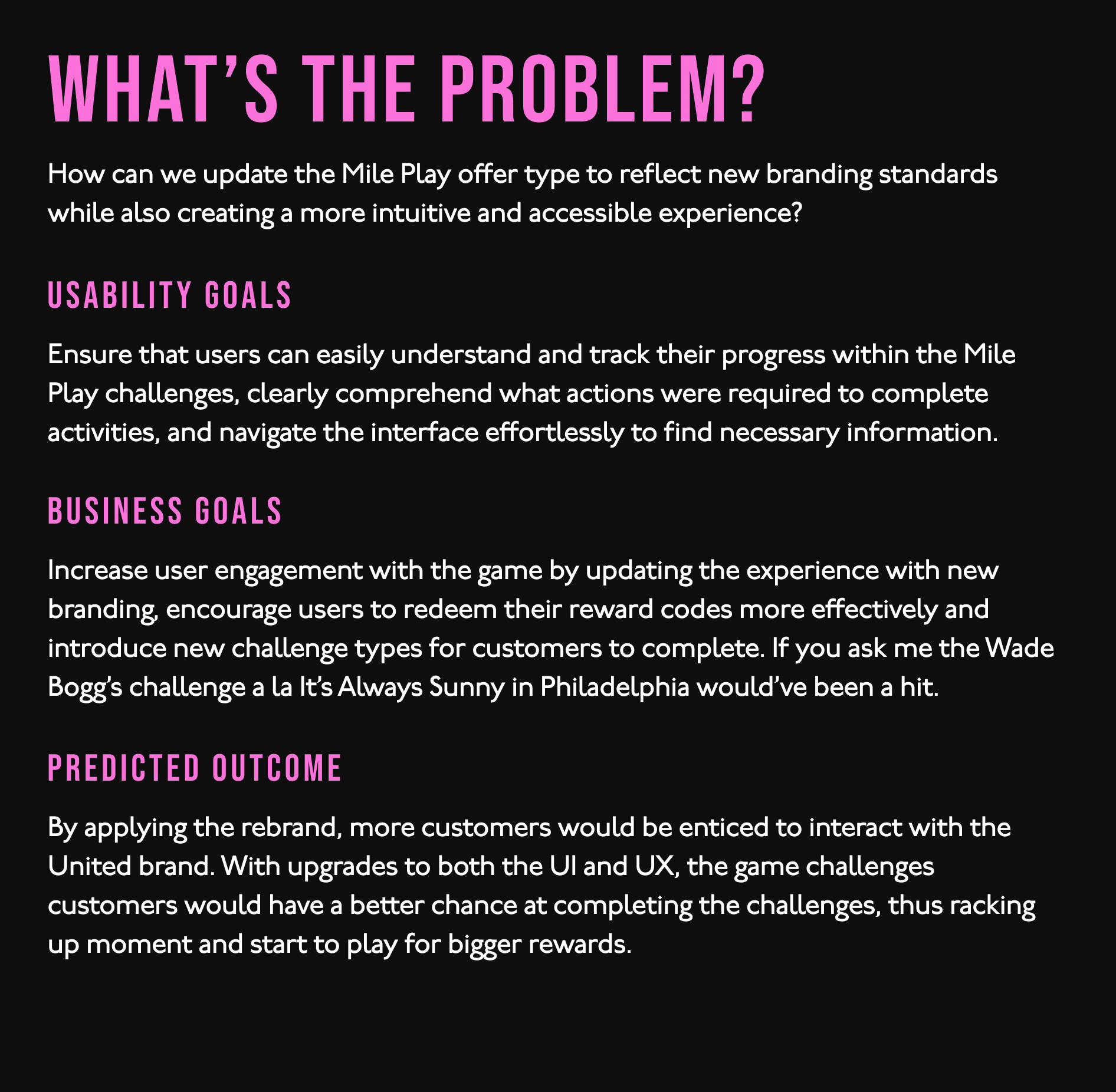 Mile Play, originally launched by United in 2019, is a gamification program designed to boost customer engagement. It generates $6 million annually through three targeted challenge types offering rewards like bonus miles, seat upgrades, and free food/drinks. These challenges are customized based on customer profiles, favoring frequent flyers. United's marketing team aimed to rebrand Mile Play with updated visuals and UX to align with the app's new look. Hey now youβre an All Star, get your game on, go play π«